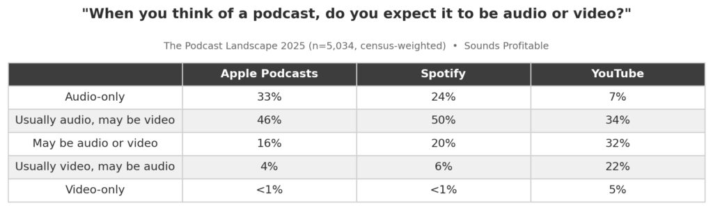 To understand why, you have to start with who Apple Podcasts actually serves, because the audiences across the three major platforms are not the same people doing the same things. They are different people (or sometimes the same people in different modes) with meaningfully different expectations for what a podcast even is. In our most recent Podcast Landscape study, we asked podcast consumers a deceptively simple question: when you think of a podcast, do you expect it to be audio or video?