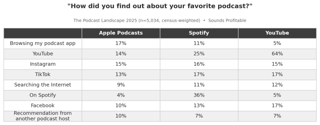 In-app browsing is still the top single source for Apple users at 17%, which tells you something about the loyalty and intent of that audience — they’re actively looking for podcasts inside a podcast app, which seems obvious but is worth noting given how much discovery on other platforms is incidental. But look at the video-native platforms: YouTube at 14%, Instagram at 15%, TikTok at 13%. These aren’t marginal numbers. Apple Podcasts users are already discovering shows through video. They’re seeing a clip on TikTok, hearing about a show in a YouTube short, scrolling past a Reel on Instagram — and then (hopefully) opening Apple Podcasts.