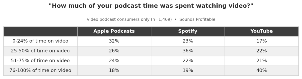 Here’s the data point that reframes everything. Among Apple Podcasts users who do consume video podcasts — and there are plenty of them — we asked how much of their total podcast time is spent watching video versus listening to audio.